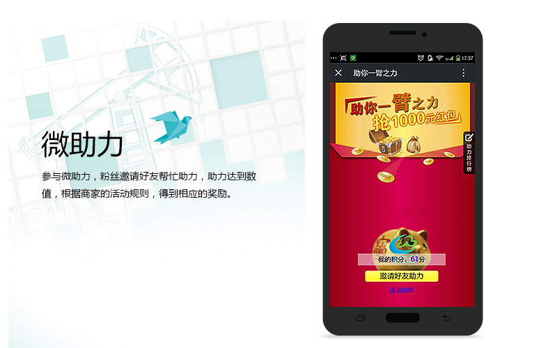 帮助商家发动粉丝力量对活动进行病毒式传播的利器,通过微信好友助力提升品牌知名度。