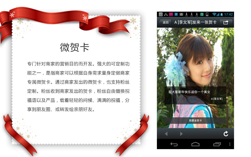 微贺卡是针对意义事件而推出的一款行业产品,主要是为有意义事件的用户们,通过使用微贺卡应用来向亲朋好友传播自己衷心的祝福与恭喜,可以展现用户想要表达的话以及情感。