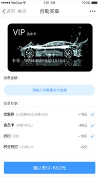 入会员卡页面,可自助买单,扫码支付,会员充