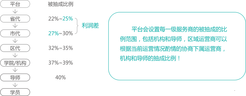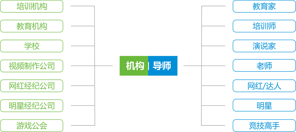 导师用户整合导师,教育家,老师,培训师,演说家,网红,明星,达人,竞技高手……等提供资源服务的最终对象。由机构跟他们确定抽成比例,如果是无机构的自由导师,则由平台协商比例。