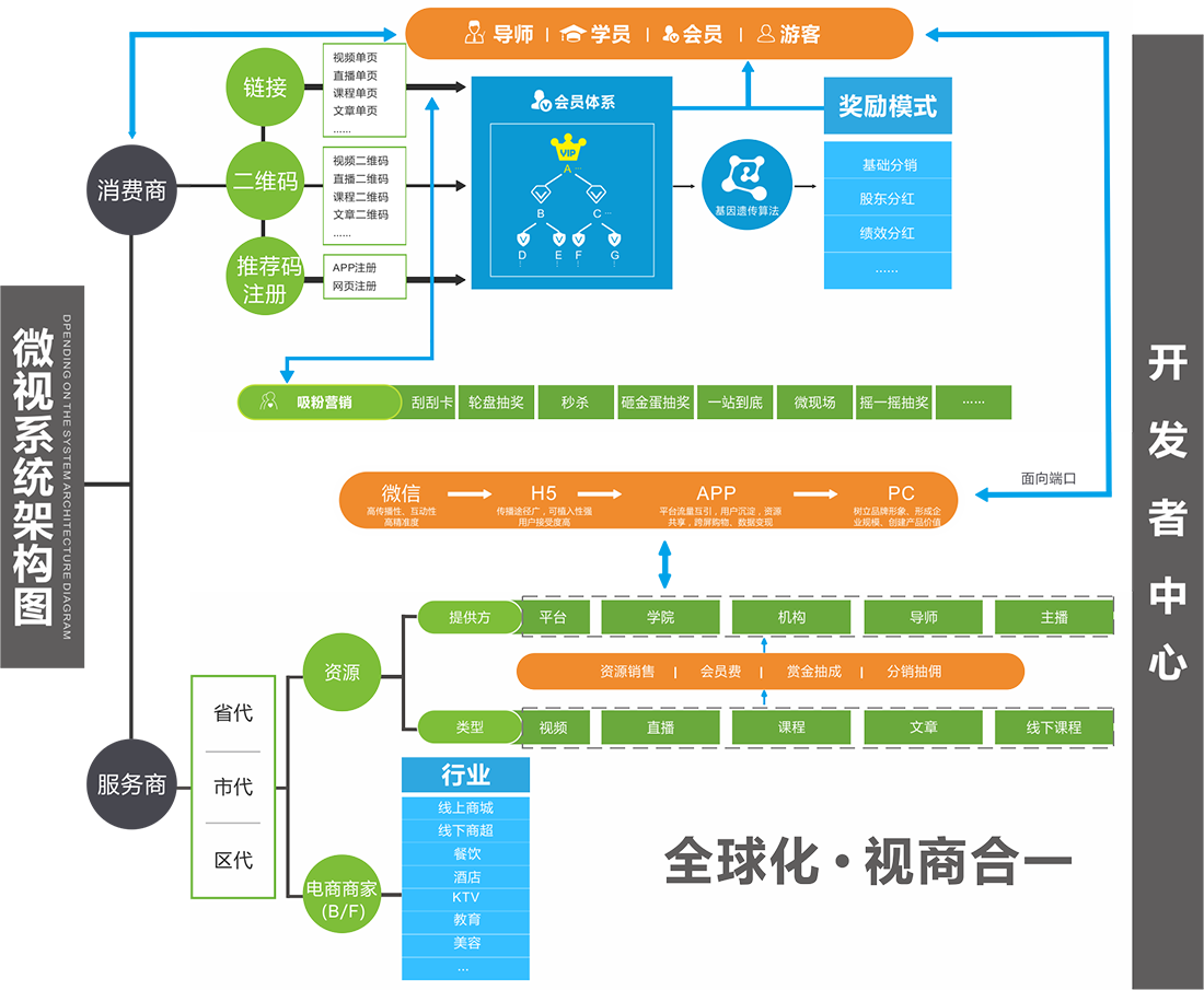 客户端上,微视平台采用“五网合一”技术:微信、H5、App(iOS)、App(Android)、PC,未来随着微信应用号的成熟,微视平台将对接微信应用号。让微视平台在微信和H5上用分销病毒式传播,再用App吸收沉淀自己的用户大数据,最后用PC树立自己的品牌影响力!